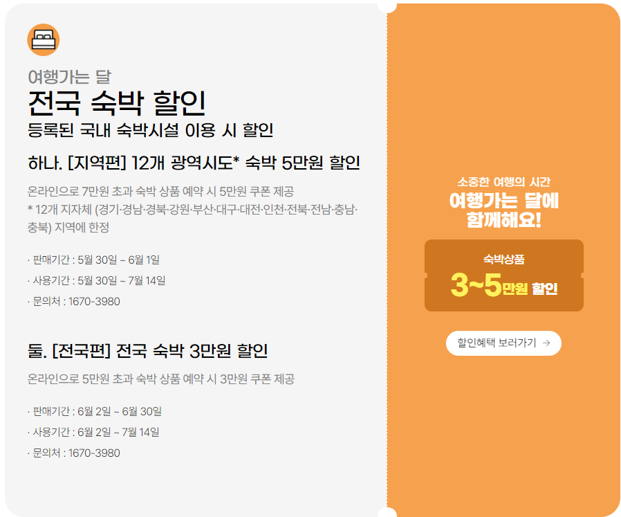 여행가는 달에는 숙박 혜택도 다양합니다. 국내 숙박 최대 5만원까지 할인된다고 하니, 둘러보시고 꼭 혜택 챙겨가세요.