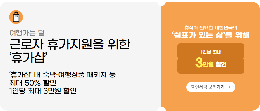 본 프로모션은 근로자 휴가지원사업 '휴가샵' 이용자 대상으로 진행되며, 조기 마감 될 수 있습니다.