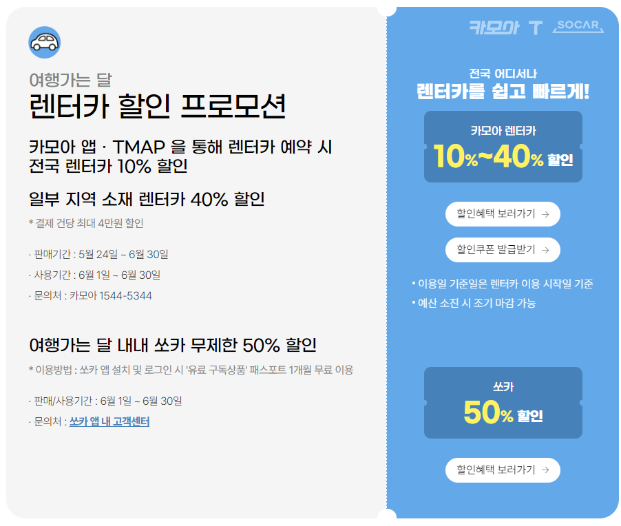 렌터카도 할인 받고 부담 없이 이곳 저곳 다녀보세요. 카모아, TMAP에서 예약하시면 됩니다.